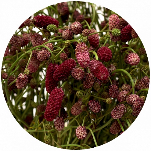 Кровохлёбка Арнгем (Sanguisorba Arnhem) . Латинское название рода происходит от слов sanguis — кровь и sorbere — хлебать, поглощать и повествует о кровоостанавливающих свойствах растения. Помимо официального, переведённого с латыни названия существует ещё целый ряд народных: бедренец, выпадошная трава, грыжник, яловый золотник, каточки, катышки, красноголовник, красные коренья, кровососка, луговка, мышьяк, наголоватень, огорошник, простудная трава, прутяк, радовик, рядовик, дикая рябина, лесная рябинка, рябинник, серебряный лист, снурок, совья стрела, совина стрела, сабина, сухозолотица, трудница, ужачье зелье, угрим, хлебенка, черноголовка, черноголовник, чернотрав, шишечки...