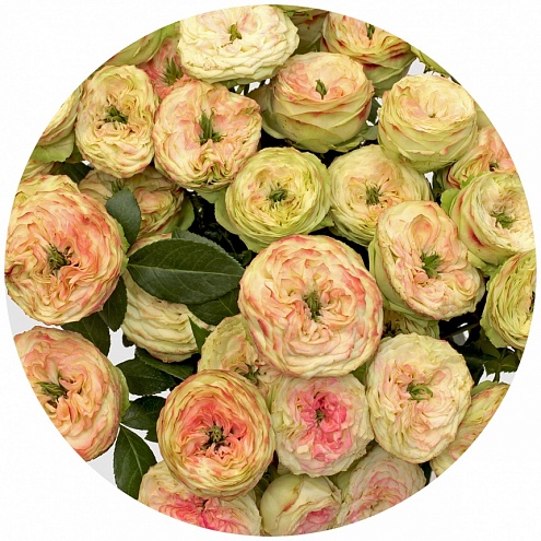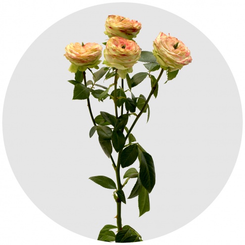 Кустовая пионовидная роза. Крупный плотный шаровидный бутон; лепестки бело-зелёного цвета с малиновым краем. Выглядит оригинально и необычно; находка для любителей стиля "винтаж".