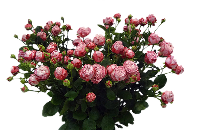 Кустовая пионовидная роза с двухцветными бутонами насыщенного розово-малинового цвета.