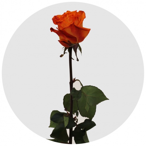Очень эффектная, огненно-оранжевая роза среднего размера; новинка.