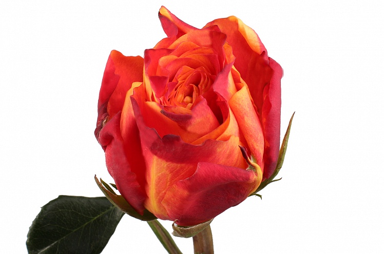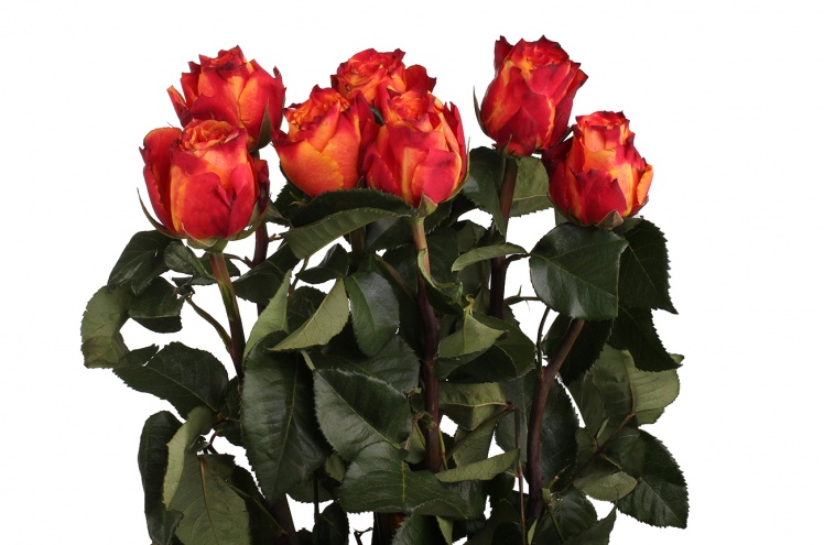Яркая кенийская роза "взрывного" оттенка - жёлто-оранжевый в центре, он переходит в тёмно-красный к краям лепестков, делая их похожими на языки пламени. Бутоны крупные, плотные, густо скрученные.