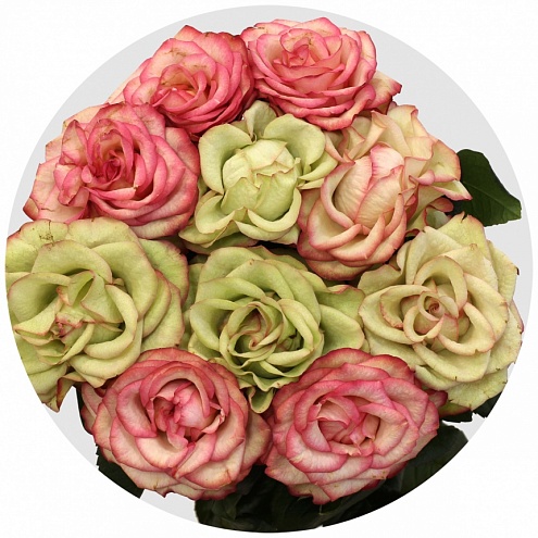 Carrousel - роза из разряда элитных; выделяется очень интересным раскрытием, групными лепестками и переливом цвета от белого и светло-салатового к розовому. Эффектно смотрится в монобукетах.