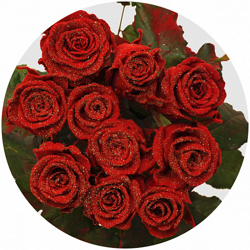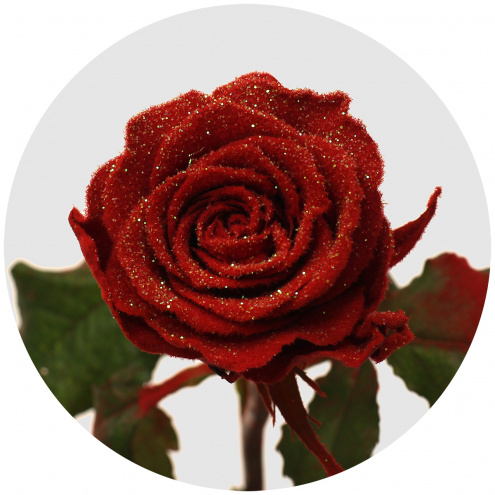 Красная роза, дополнительно покрытая бархатистым красным налётом и серебристыми блёстками.