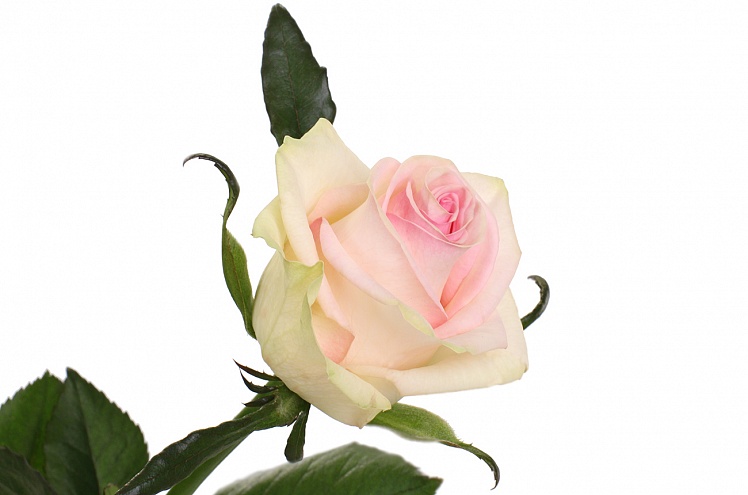 Пионовидная роза. Крупный бутон, цвет лепестков от нежно-персикового до кирпичного с красивой зелёной "рубашкой" у основания.