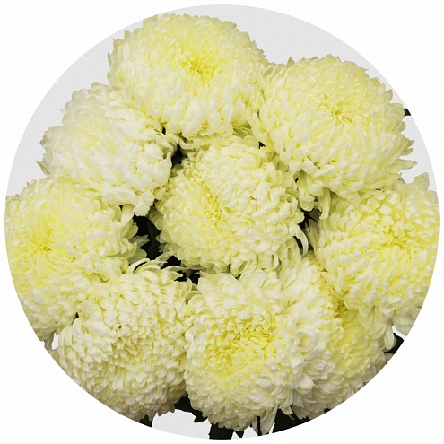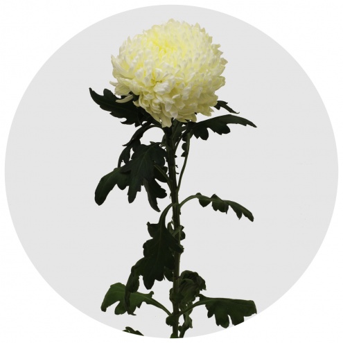 Махровая крупноцветковая хризантема. Большая, до 14 см, шапка из ярких белых с лимонным оттенком "взъерошенных" лепестков, скрывающих сердцевину.