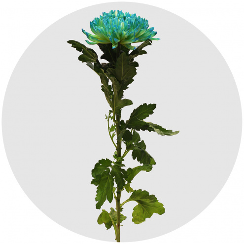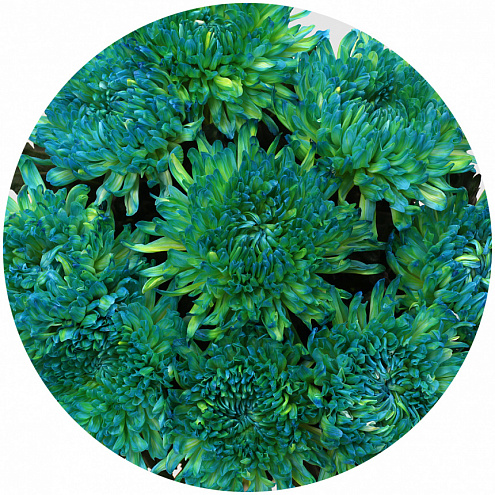 Double Mint ("Двойная мята"). Хризантема с большим махровым цветочным куполом на длинном стебле. Необходимый оттенок получается путём окрашивания белой хризантемы при помощи добавления в воду цветных питательных растворов.