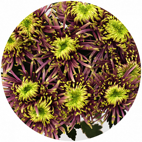 Балтазар - паукообразная хризантема, которую отличает оригинальный лиловый окрас, переходящий в зеленый цвет на кончиках лепестков.