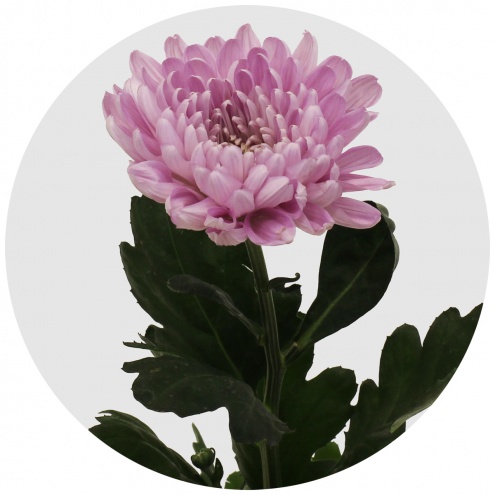 Крупная, пышная хризантема очень нежного светло-розового оттенка. Стебель длиной до 70 см с густой листвой.