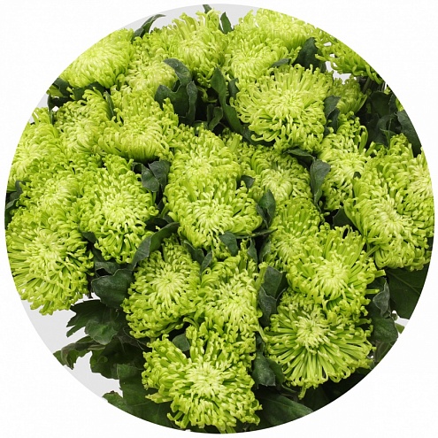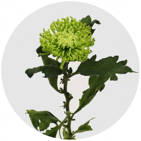Хризантема экзотического вида, с зелёными заострёнными лепестками, загибающимися вовнутрь. Крупный цветок на длинном, 70 см, стебле.