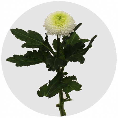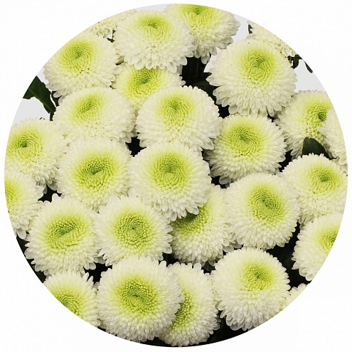 Сайбериа - Сибирь - новинка 2018 года, белая помпонообразная хризантема. Её белые лепестки, разумеется, олицетворяют собой заснеженные сибирские просторы, а зелёная серединка - то ли отблески зимнего солнца на хвое, то ли дремлющую под снегом в ожидании весны жизнь...