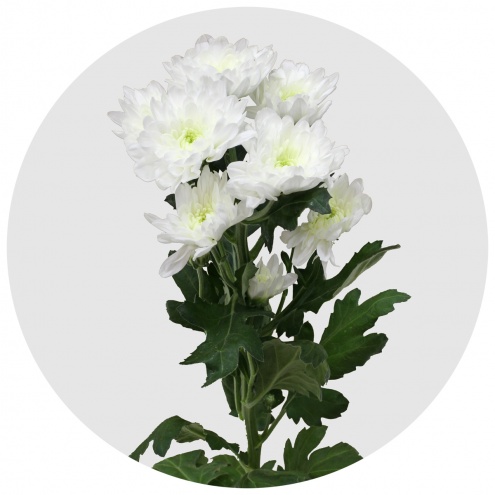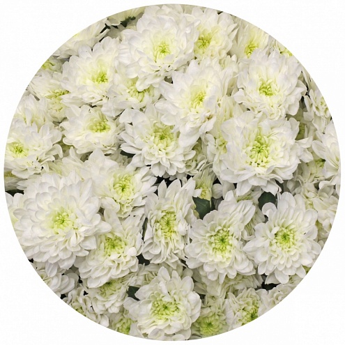 Кустовая хризантема "Гарвард" с белоснежными лепестками и бледно-зелёным центром. Размер цветка - до 7 см.
