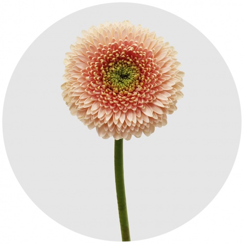 Светло-розовая гербера мини Белфи помпон. Размер цветка мини-гербер - 5-9 см. Это красивый цветок семейства астровых, напоминающий ромашку. Поэтому цветок имеет второе название - transvaal daisy — «трансваальская ромашка». Цветок кажется очень естественным и простым, "природным".