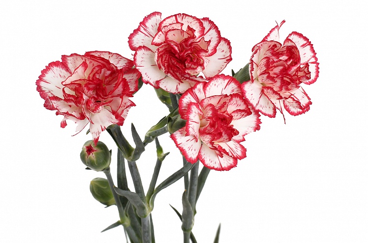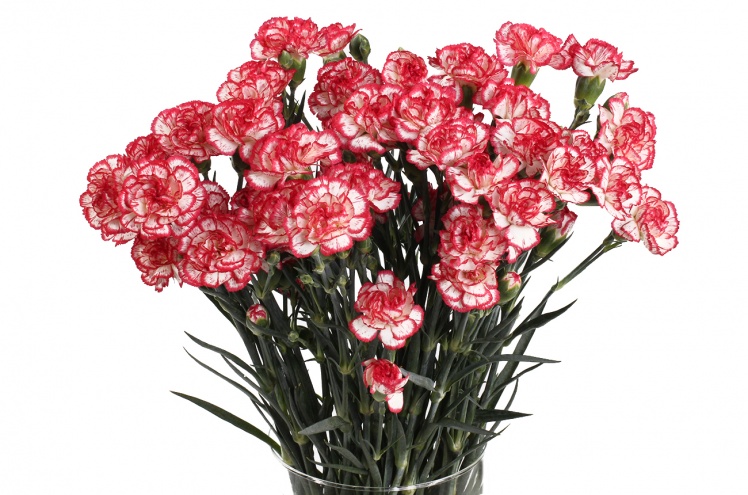 Двухцветная кустовая гвоздика. Белые лепестки с ярко-розовым обрамлением и штрихом.