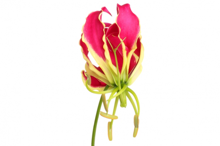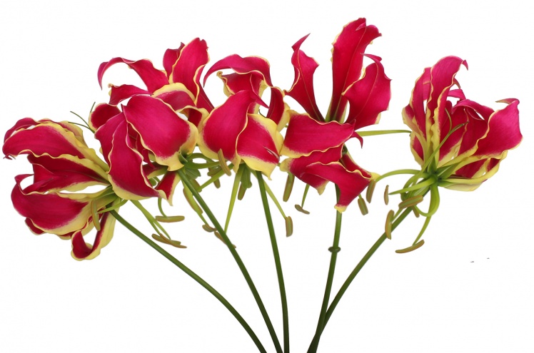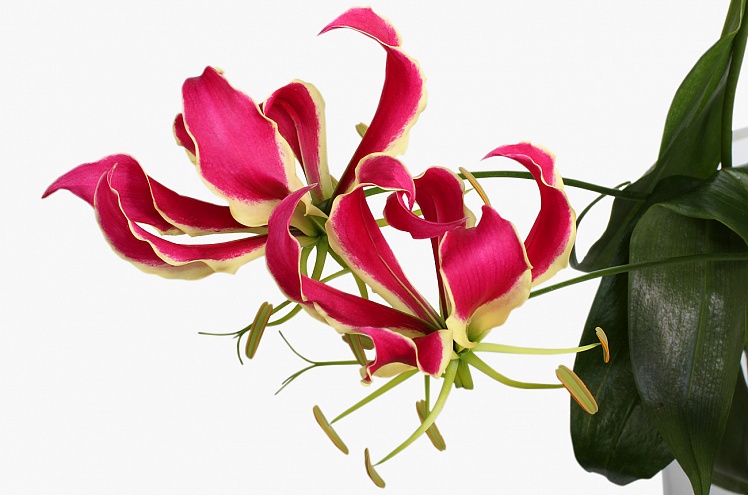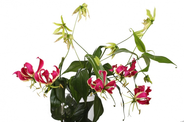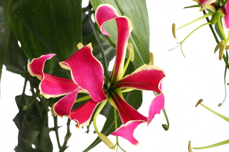 Очень красивое экзотическое растение родом из тропических лесов Южной Африки и Азии. Относится к семейству Мелантиевых. Вьющееся, с ползучим стеблем; попросту - лиана. Цветок называют ещё "пламенной лилией" из-за необычной формы лепестков, похожих на языки пламени - волнистых, отклоняющихся, яркого красного цвета.
