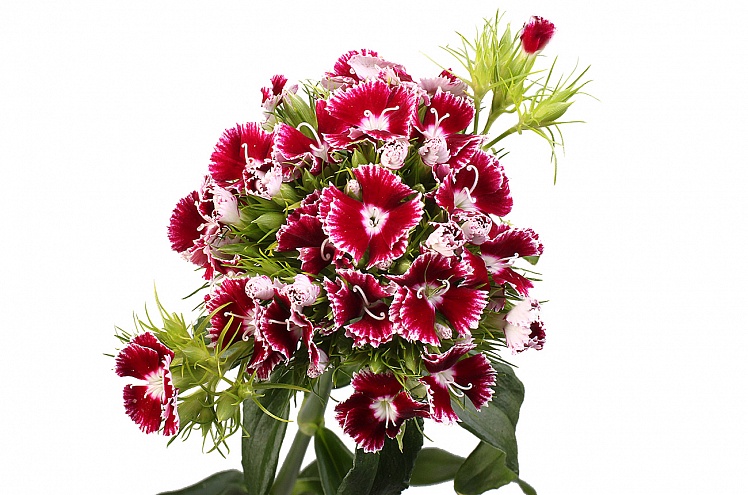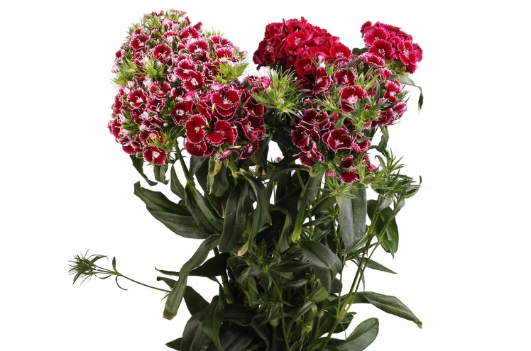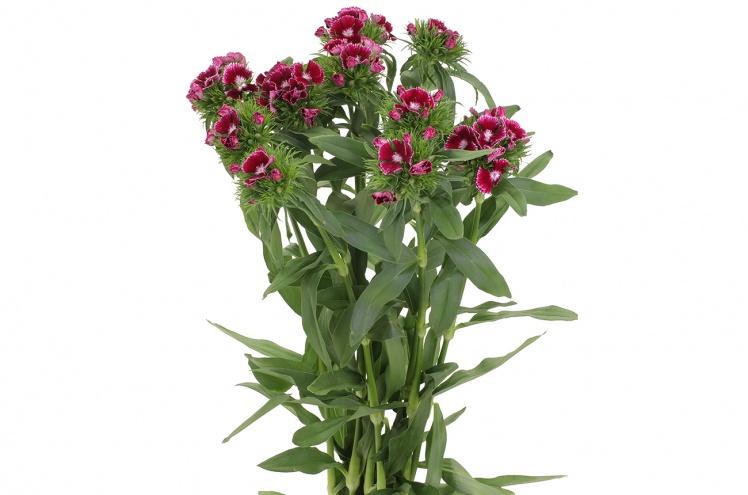 Диантус барбатус (лат. Diánthus barbátus) - гвоздика турецкая, или гвоздика бородатая. Культивирование цветка началось много веков назад на юге Европы и в Азии; в 16 веке он был уже очень популярен во всей Европе. Небольшие цветки размером 1,5-3 см собраны в щитковидные / шапковидные соцветия. На одном растении может быть несколько соцветий, а в одном соцветии может быть до 30 цветков, поэтому внешне это выглядит как небольшой цветущий кустик. Выведено огромное количество сортов этого растения самых разнообразных цветов, оттенков и их смешений. В данном случае это двухцветная бело-лиловая гвоздика.
