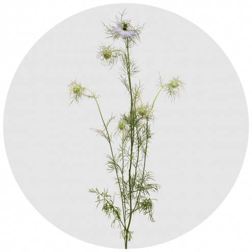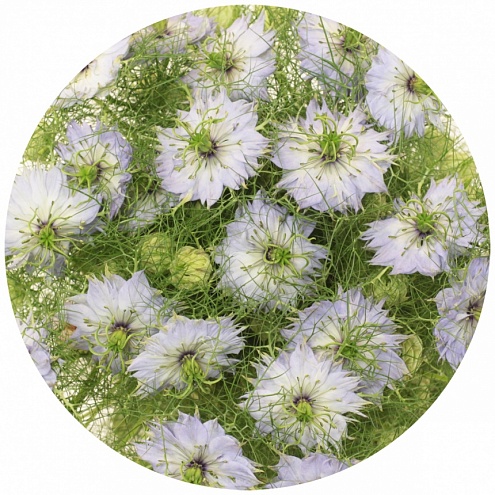 Нигелла - растение семейства лютиковых, однако по сравнению с обычным лютиком выглядит довольно экзотично. Латинское название также имеет в своей основе корень "чёрный" (niger), а причиной тому - семена растения угольно-чёрного цвета. В Европу растение попало из Индии. Разумеется, через Англию, где, не разобравшись, дали цветку целый сонм прозвищ: благословенные семена, черный тмин, мускатный цветок, калинджи, цветущий фенхель, черный сезам... Но - то ли увы, то ли ах - под внешней необычностью цветка скрывалась совсем не аристократическая родословная, происходящая от простого, но милого сердцу и глазам лютика. На языке цветов нигелла означает "смущение", что, пожалуй, достаточно точно характеризует этот одновременно прекрасный и скромный цветок. Этакая цветочная Золушка, волшебным образом попавшая на бал и ставшая принцессой...