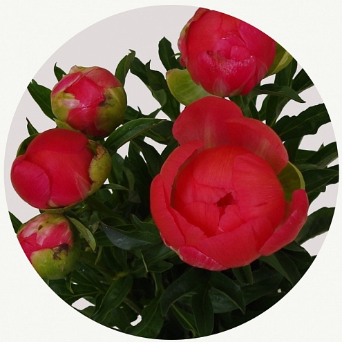 Серия "коралловых" пионов была выведена в середине шестидесятых годов двадцатого века американцем Сэмом Уиссингом и канадцем Лимэном Казенсом. Корал шарм - "коралловое очарование" - один из фаворитов этой серии. Цветок отличает оригинальная раскраска бутона, меняющаяся от темно-розового поначалу к светло-коралловому с белоснежной каймой по мере распускания, доходя до желтоватой на заключительной стадии цветения. Удачное сочетание внешних достоинств и романтического названия уже больше чем полвека "не отпускает" любителей пионов. Букет прекрасных коралловых цветов, бокал мартини и немного воображения - и перед