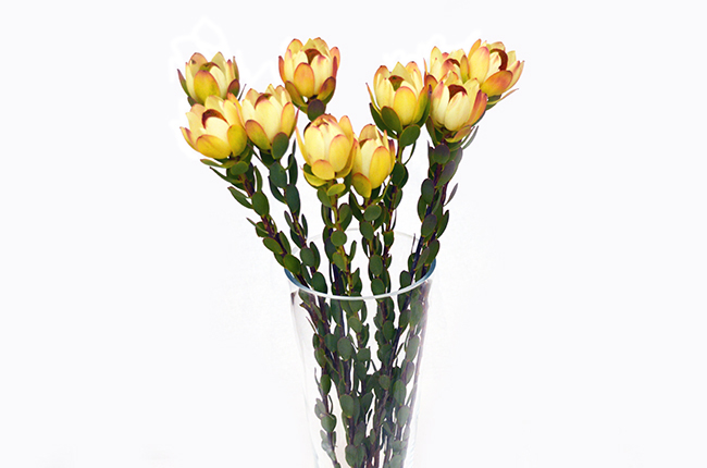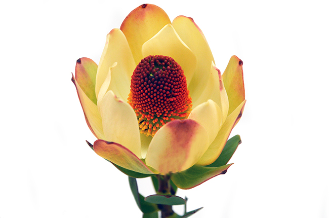 Леукадендрон с красивым красным "помпоном" в центре цветка.