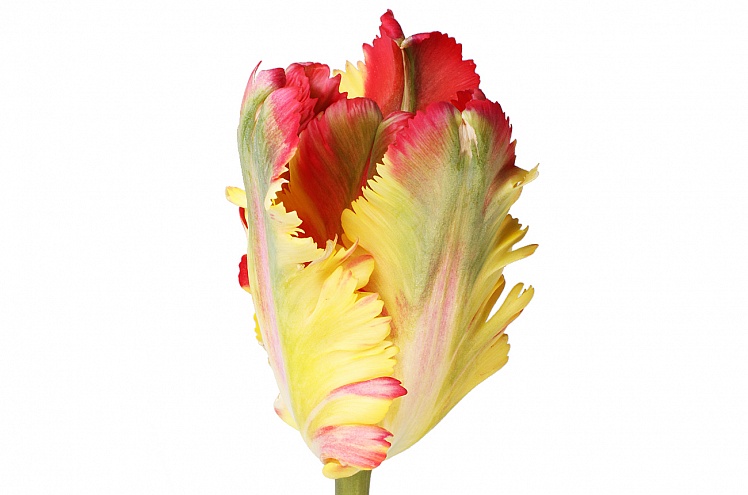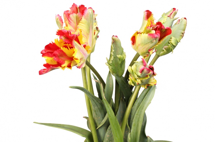 Тюльпан из группы попугайных. Пёстрый, яркий, экзотически вычурный. Гофрированный бокал с лепестками жёлто-кремового цвета и красными вертикальными полосами. В диаметре может достигать 20 см, высота стебля - 50-70 см.