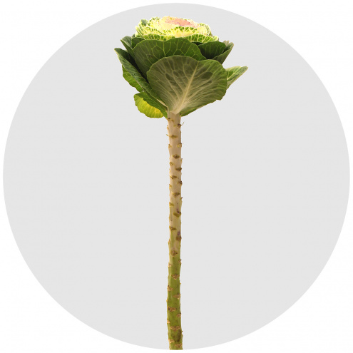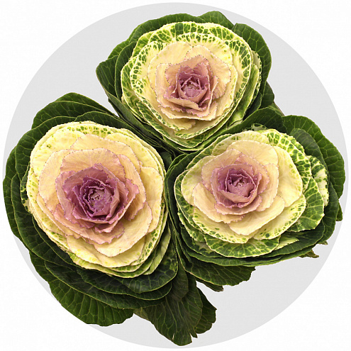 Двухцветная декоративная капуста из сортосерии Crane. Хоть она и называется "биколор", видимых цветов в ней больше, чем два: фиолетовая в середине, далее кремовая, потом бело-зелёная и внешние листья - тёмно-зелёного цвета. Разумеется, это не вариант для монобукета - это было бы слишком оригинально; а вот как элемент аранжировки осеннего букета брассика просто великолепна.