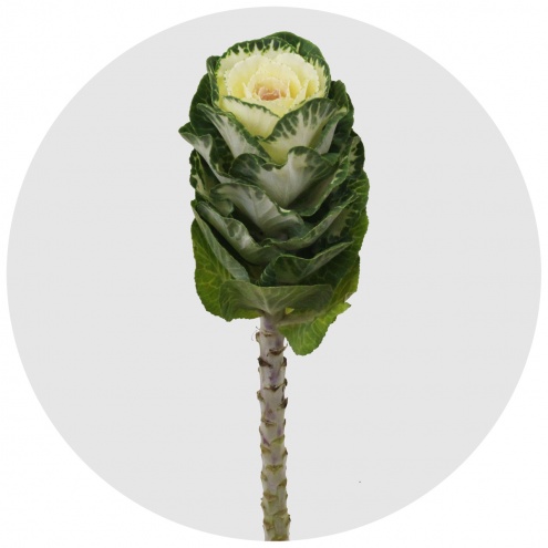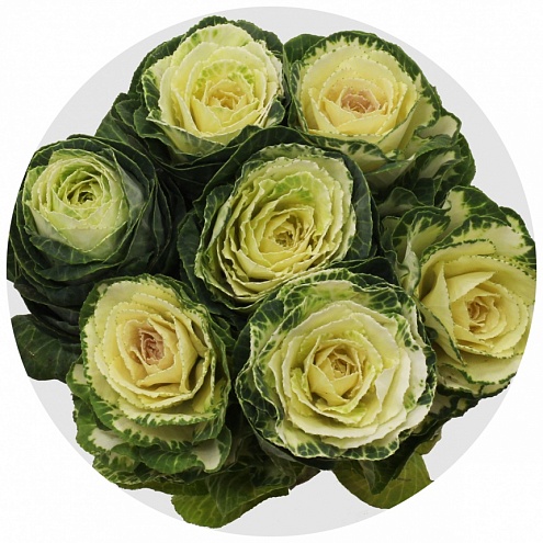 Брассика Крейн белая. Декоративная капуста кремово-белого цвета. Как и у других сортов брассики, внешние листья - зелёного цвета.