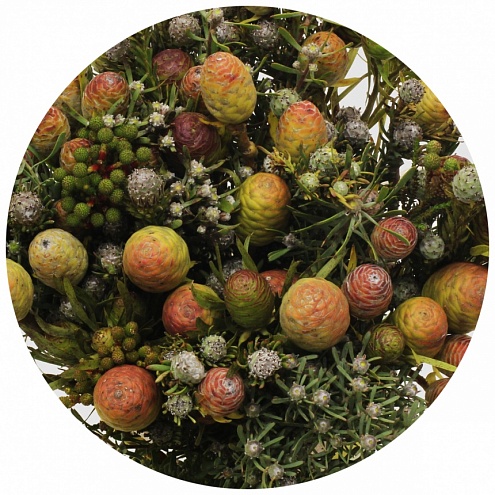 Невероятно красивый экзот из Южной Африки. Пучок такого каапса - и у вас готовая рождественская композиция; этот южноафриканский гость кажется до боли родным, своими шишечками-иголочками напоминая наши северные ели, сосны и можжевельники. А если до Рождества ещё далеко, то по отдельности веточки каапса, добавленные в букеты и композиции, придают им своеобразной лесной сказочности.
