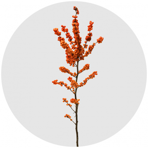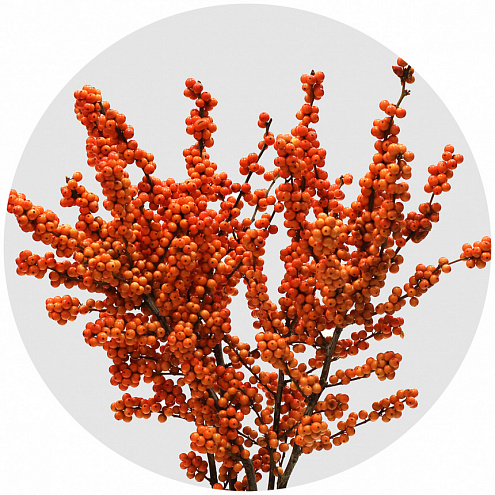 Илекс "Зимнее золото". Ветки, усыпанные гроздьями оранжевых, недоспелых ягод.
