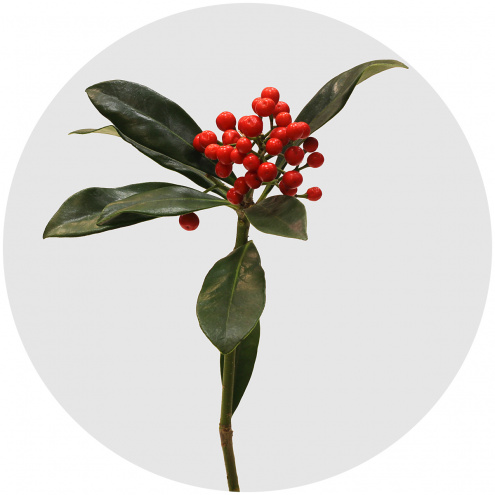 Скиммия - вечнозелёный кустарник семейства рутовых, родом из Юго-восточной Азии. Листья зелёные, сверху темнее, чем снизу, иногда с красно-коричневой окантовкой. На изнанке листа находятся особые железы, начинающие выделять ароматические вещества при прикосновении. Цветёт мелкими цветками, которые собраны в плотные кисти. Но основная прелесть скиммии  в густорастущих ярко-красных ягодах, придающих особый колорит флористическим композициям.