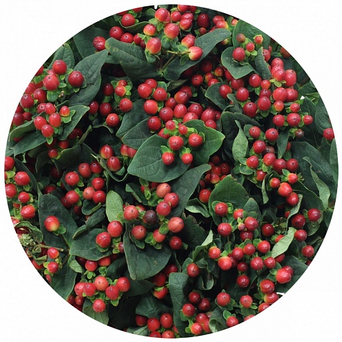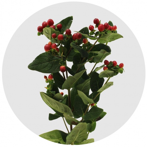 Хиперикум, или зверобой. Издревле известен как целебное средство. Популярность у флористов снискал не благодаря цветам или листьям, а благодаря плодам. Это густорастущие ярко-красные кожистые ягоды, добавляющие колорита и объёма во флористические композиции и букеты.
