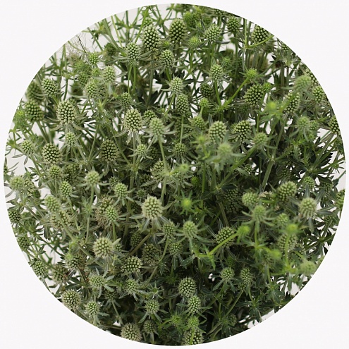 Эрингиум, он же синеголовник, растение из рода зонтичных. Соцветие напоминает чертополох; плотное, головчатое, продолговато-цилиндрической формы. Зубчатые листочки обёртки голубого или синего цвета образуют подобие чаши, а сама обёртка больше соцветия. Стебель достаточно толстый, разветвляющийся в верхней части. Очень эффектно смотрится в составе флористических композиций, наполняя их экзотикой.