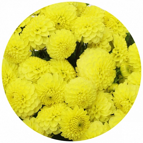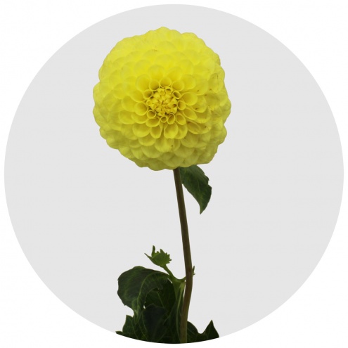 Ярко-жёлтая помпонная георгина. Шаровидный бутон, свёрнутые в трубочку лепестки. Может быть ярким акцентом в составном букете и интересным вариантом для монобукета.