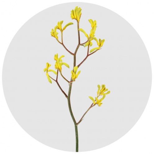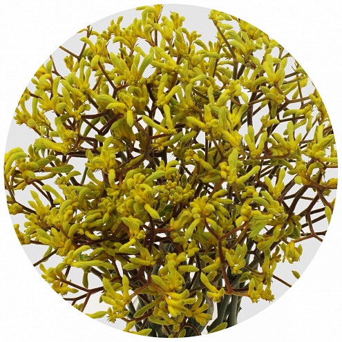 Анигозантос жёлтый, так же как и оранжевый, имеет не чётко выраженный цвет, а смесь полутонов, перетекающих от зелёного к жёлтому. Пучок таких веточек выглядит как крона осеннего дерева, поэтому они прекрасно дополняют тематические, "осенние" букеты.