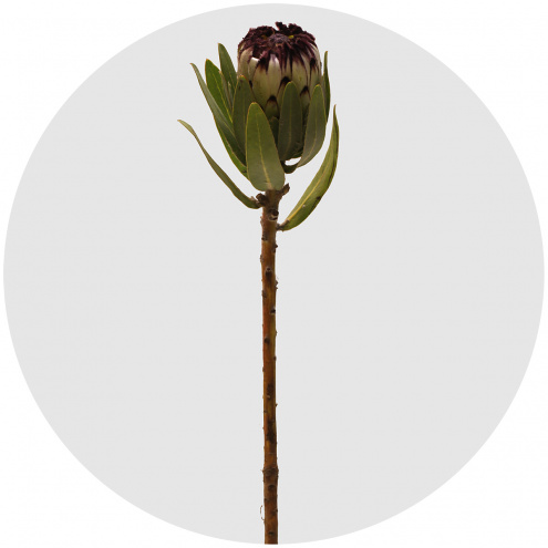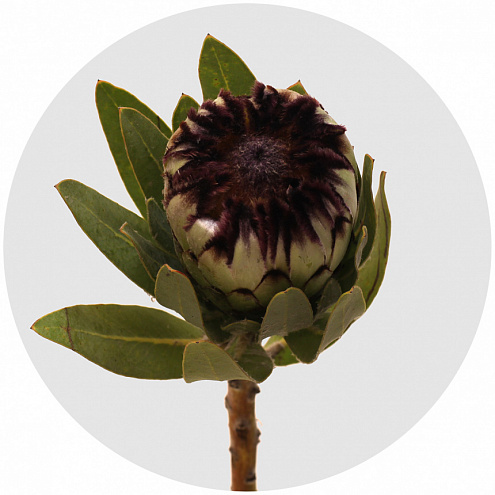 Протея Ниобе - ещё одно удивительное растение с африканского континента с пушистыми лепестками, похожими на птичьи перья. Ещё одно название растения - сахарный кустарник. Лепестки-перья белые, длинные, с тёмно-фиолетовыми волосками на закругленных концах. Внутренние цветки - бордово-фиолетового цвета.