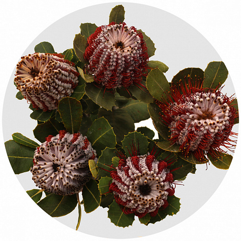 Banksia coccinea или банксия ярко-красная - удивительное растение родом с австралийского континента. Представляет собой вертикальный кустарник или небольшое дерево в семействе Proteaceae. Нунгарские народы знают это дерево как Ваддиба. Banksia coccinea удивляет не только своим режимом - это ночное растение, которое днём отдыхает. Самое удивительное в ней то, что коробочки, хранящие семена, раскрываются под действием очень высоких температур или, проще говоря, пламени. Это случается, когда на температурном пике происходит самовоспламенение сухих растений. Такая вот огненная coccinea, в самом прямом смысле этого слова. Да и внешне она тоже - "огонь".