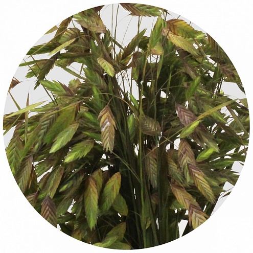 Хасмантиум широколистный или латифолиум (Chasmanthium latifolium) - злак северо-американского происхождения. Листья сочного зелёного цвета; соцветия - колосовидные, плоские, свисающие на тоненьких стебельках. Соцветия играют оттенками зелёного, красно-бурого, золотистого и напоминают то ли аквариумных рыбок, то ли блестящих жуков.