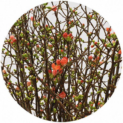 Хеномелес, или айва, красного цвета. Высокие полутораметровые ветви с небольшими скромными цветами похожи на пробуждающийся весенний сад в миниатюре. Замечательный вариант для аранжировки весенних композиций.
